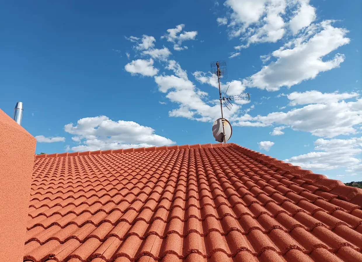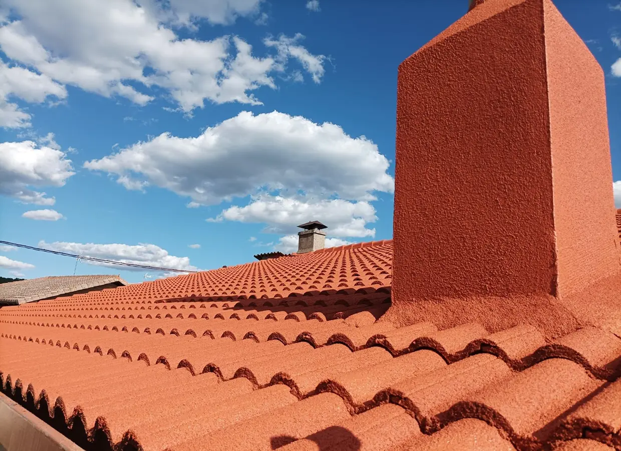 Aplicación de ELASTICOVER TECH tejado de teja como corrector térmico trabajo en Navaleno (Soria).